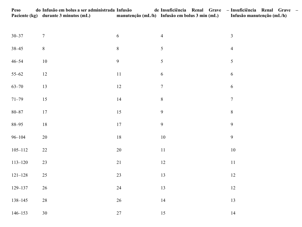 A tabela a seguir é fornecida como guia para ajuste posológico com base no peso do paciente.